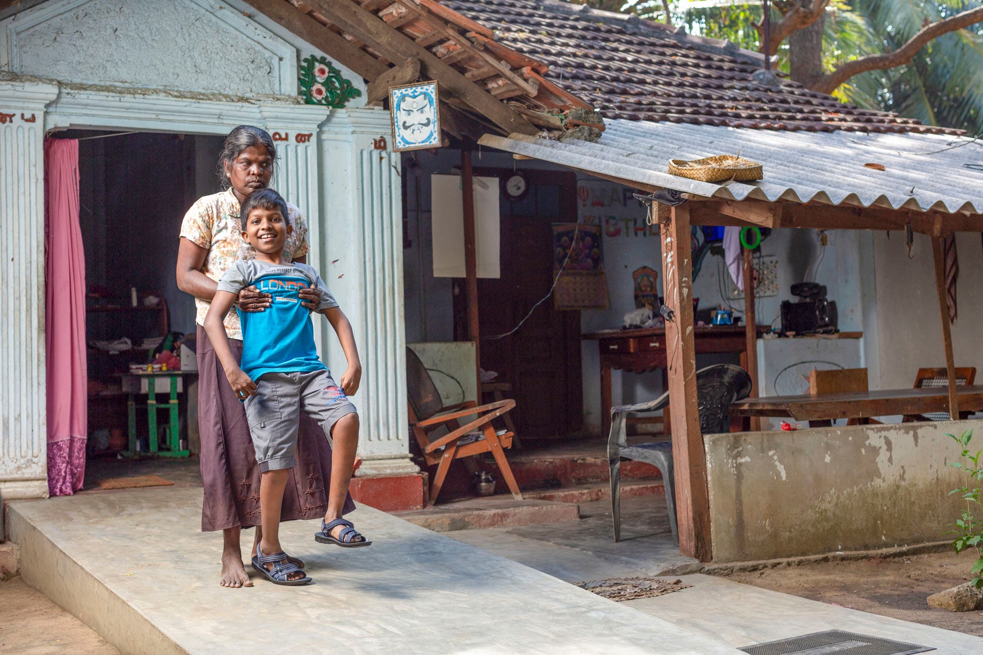 Die 46-jährige Sriskantharasa Vijayakumari hilft ihrem Sohn Tishanthan jeden Tag eine halbe Stunde bei den Physiotherapie-Übungen zu zweit: «Tishanthan ist mit schwachen Armen, Beinen und Händen geboren worden. Er kann nicht allein gehen. Die Ärzte sagten, es gebe Hoffnung. Wenn wir seine Beine trainieren und Muskelkraft entwickeln, werde Tishanthan eines Tages allein gehen können. Daran glauben wir!»